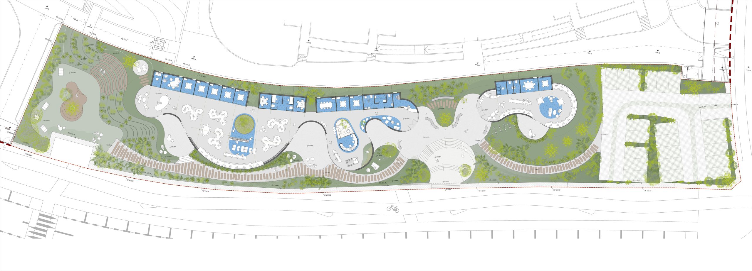 El espacio de la parcela, de 3.556 m², está dividido en dos volúmenes, uno es de uso exclusivo privado de oficinas con espacios abiertos que se concatenan unos con otros mezclando zonas de trabajo con zonas de esparcimiento. El otro, más pequeño, está destinado a coworking o a espacio multifuncional dentro de las oficinas.